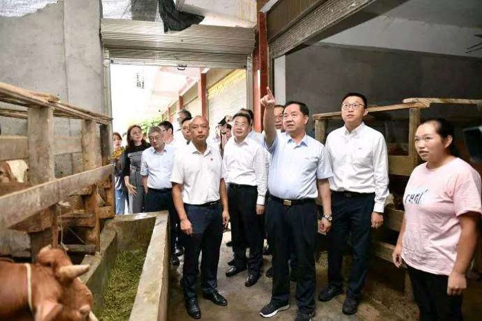 在高峰村脫貧致富帶頭人趙雪紅家里,陳肇雄走進牛棚認真查看養殖情況,親切詢問飼養數量、年收入情況。趙雪紅家曾經因為一次突發的特大山洪,失去了親人,也幾乎喪失了對生活的信心。在中國電科家庭式母牛散養項目啟動后,她主動報名參與,并按照散養要求,全身心的做好科學飼養。2019年,趙雪紅賣了5頭半大牛犢,換來了近5萬元的收入,家里還有8頭牛在欄,價值近20萬元。陳肇雄對趙雪紅自立自強的精神表示贊賞,對其家庭的扶貧變化感到高興,叮囑她要發揮好致富帶頭人作用,帶動更多鄉親脫貧致富。
