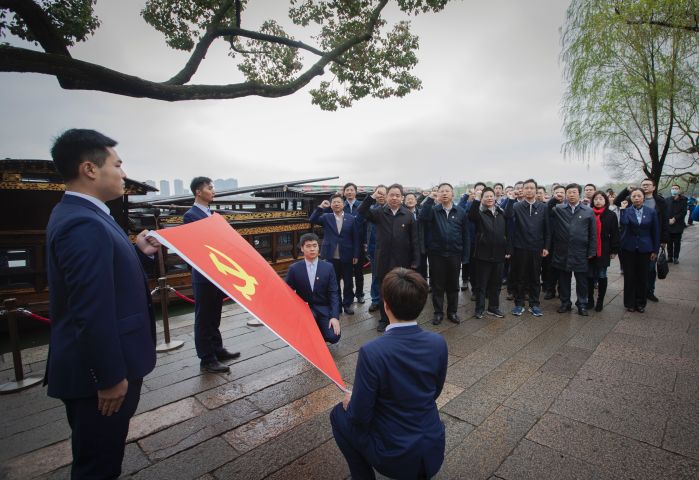 面向黨旗,莊嚴宣誓。在革命紅船啟航地南湖,陳肇雄帶領參加活動的全體黨員同志,面向黨旗,舉起右手,重溫莊嚴的入黨誓詞,讓熱血在紅色圣地再次沸騰。
